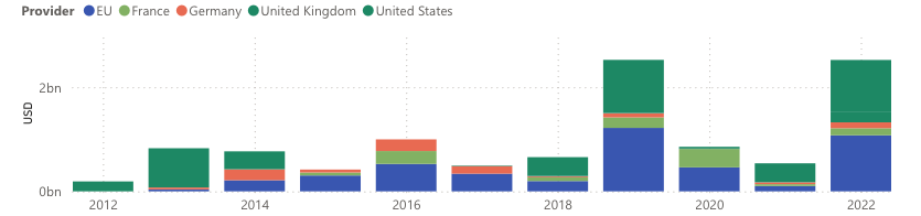 Main destinations of EU bilateral public climate-related development finance: combined total (in USD)
