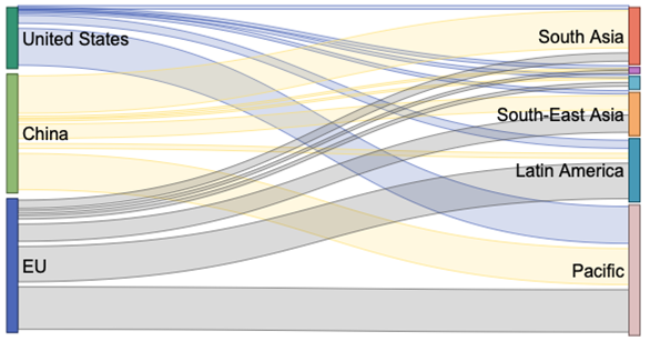For electric vehicles, the Pacific region is currently the largest importer, followed by South Asia and Latin America. China is the main EV supplier to South Asia, while the EU leads in exports to Latin America. Though overall demand for EVs remains lower than for solar panels, the growth in exports reflects an emerging interest in sustainable mobility, with the Pacific acting as an early adopter.