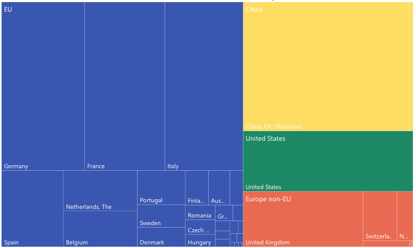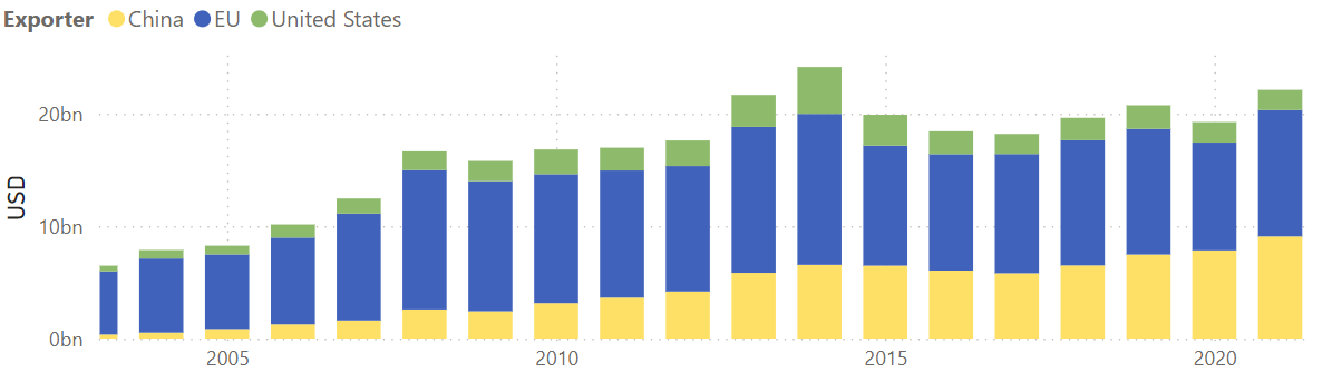 For wind power, Latin America is again the primary destination, with the Pacific and South-East Asia also registering high import volumes. While EU exports dominate in Latin America, demand in the Pacific and South-East Asia is now met by both the EU and China in roughly equal measure.