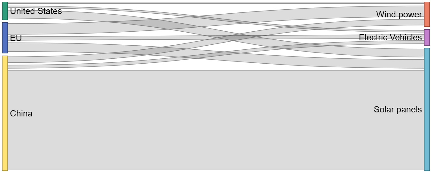 This dominance became particularly pronounced from 2015 onwards, peaking in 2021. Electric vehicles (EVs) represent the second-largest export category, with China again leading, closely followed by the EU. Although the EV market is growing rapidly, export volumes remain below those of solar panels, suggesting that demand for electric vehicles in developing countries is still maturing. Wind power technologies are the third most exported category, and in this area, the EU leads in cumulative exports. While the EU dominated wind power exports from 2012 to 2021, China overtook it in 2018, reflecting shifting global competitiveness in the sector.